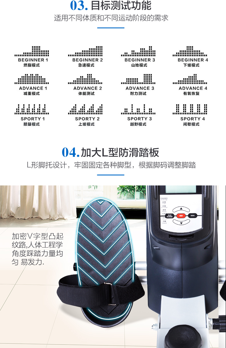 顯示功能:時間、阻力、次數(shù)、距離、卡路里、瓦特值、程式